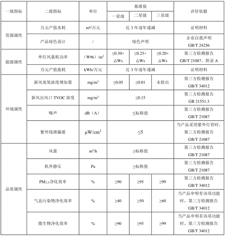 新风净化系统评价指标包括资源属性指标、 能源属性指标、 环境属性指标和品质属性指标。 不带热回收功能新风净化系统指标应符合表2的要求; 带热回收功能新风净化系统应符合表3的要求。