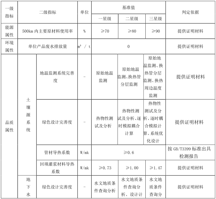 5.2 按照 4. 1 基本要求和 4. 2 评价指标要求开展第三方评价, 采用符合性评价方法, 分为一星级、 二星级、 三星级 3 个等级。 对于地热能交换系统和水(地) 源热泵机组, 3 个等级的绿色建材均应满足所有基本要求, 并根据对某一评价等级的全部评价指标要求满足情况, 最后确定为一星级、 二星级、 三星级。 对于地源热泵系统评价则取地热能交换系统和水(地) 源热泵机组分别满足星级标准中较低者, 作为系统星级。